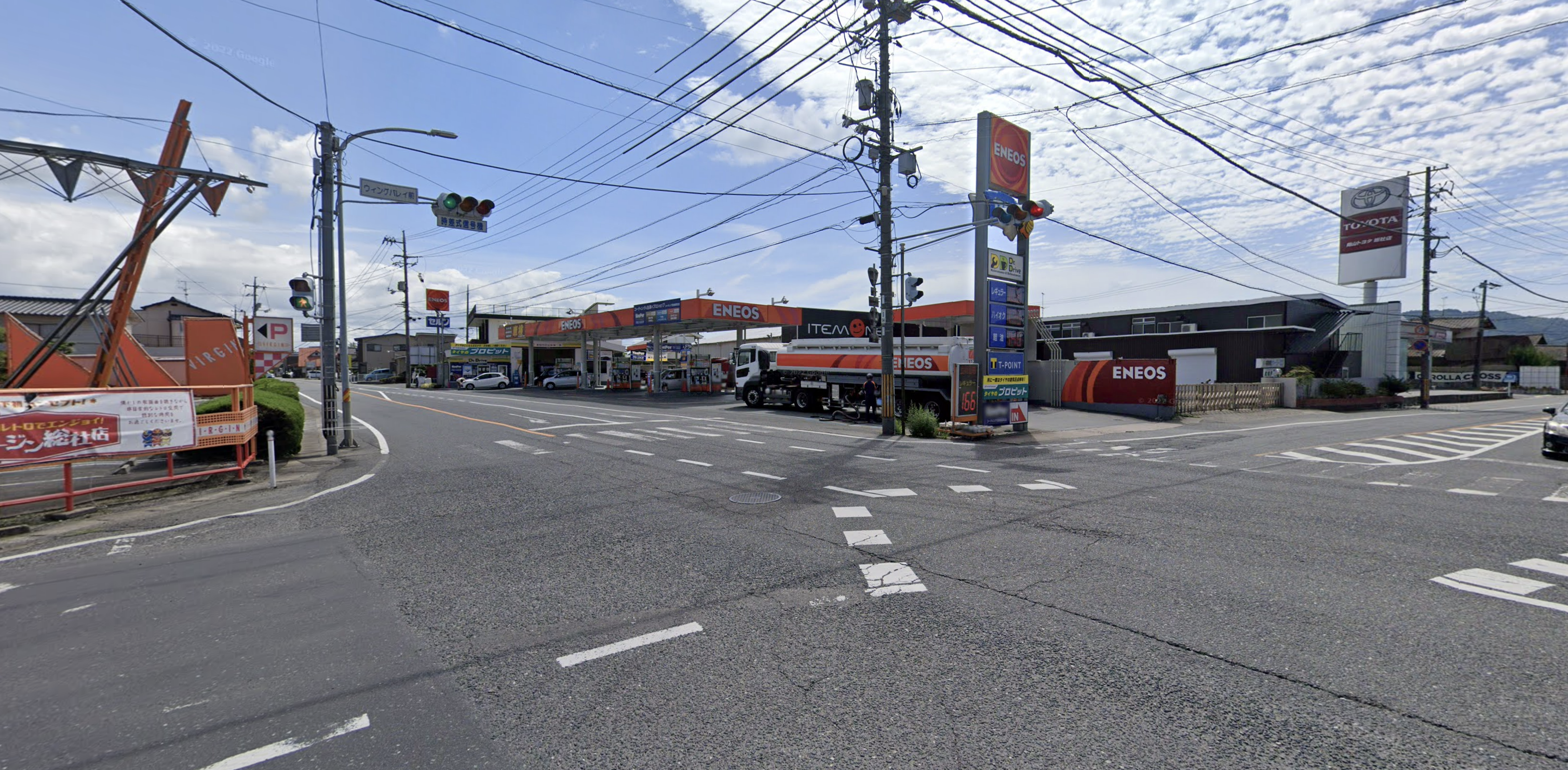 ウイングバレエ、ENEOS、総社大橋、バージンが交差する交差点。交通量も多い。